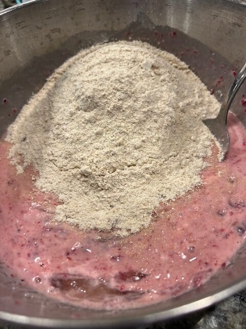 Add the wet ingredients to the dry ingredients and mix gently until fully combined. Avoid mixing too much. Incorporate the cranberries and nuts if desired.